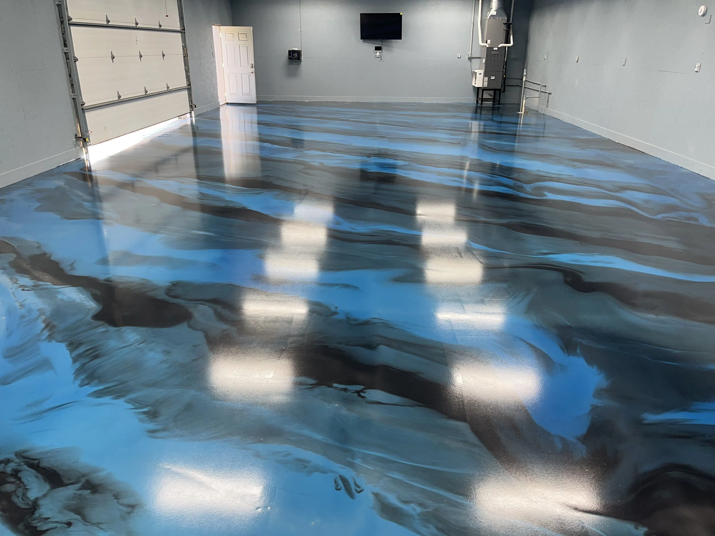 Benefits of Metallic Epoxy Coatings: Metallic epoxy floors offer a striking, high-end appearance that instantly elevates the look of commercial and residential spaces. Their seamless surface is highly durable, resisting stains, chemicals, moisture, and heavy foot traffic, making them ideal for businesses and high-use areas. Metallic epoxy floors are easy to clean and maintain because they have no grout lines or joints where dirt can accumulate. They are also fully customizable, with endless color combinations and design effects to match branding or décor. Overall, metallic epoxy flooring delivers a long-lasting, visually impressive solution that combines performance with modern style..